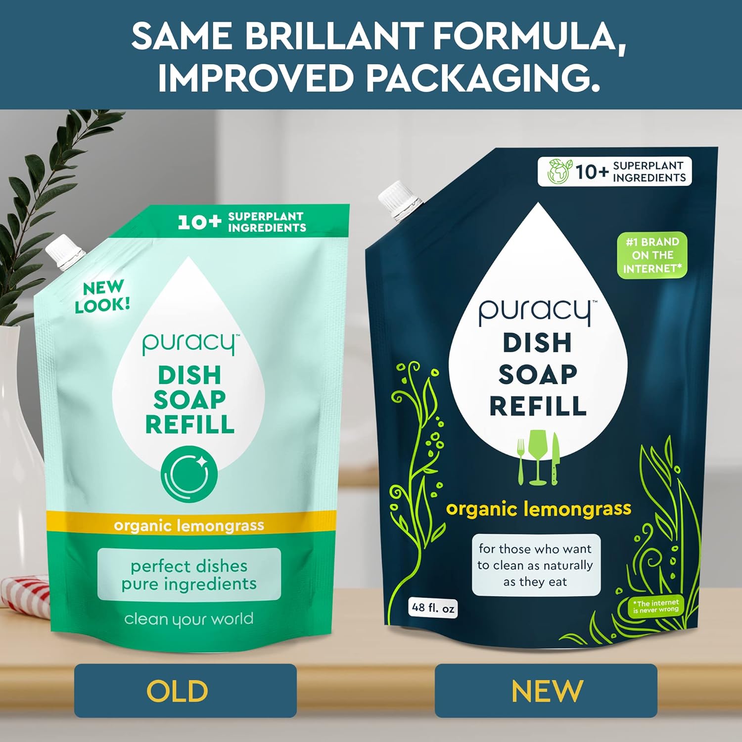 Puracy Natural Dish Soap Refill - Skin-Softening Plant-Based Liquid Dishwashing Detergent Soap, Clean-Rinsing Water-Sheeting Formula (Organic Lemongrass, 48 fl oz)