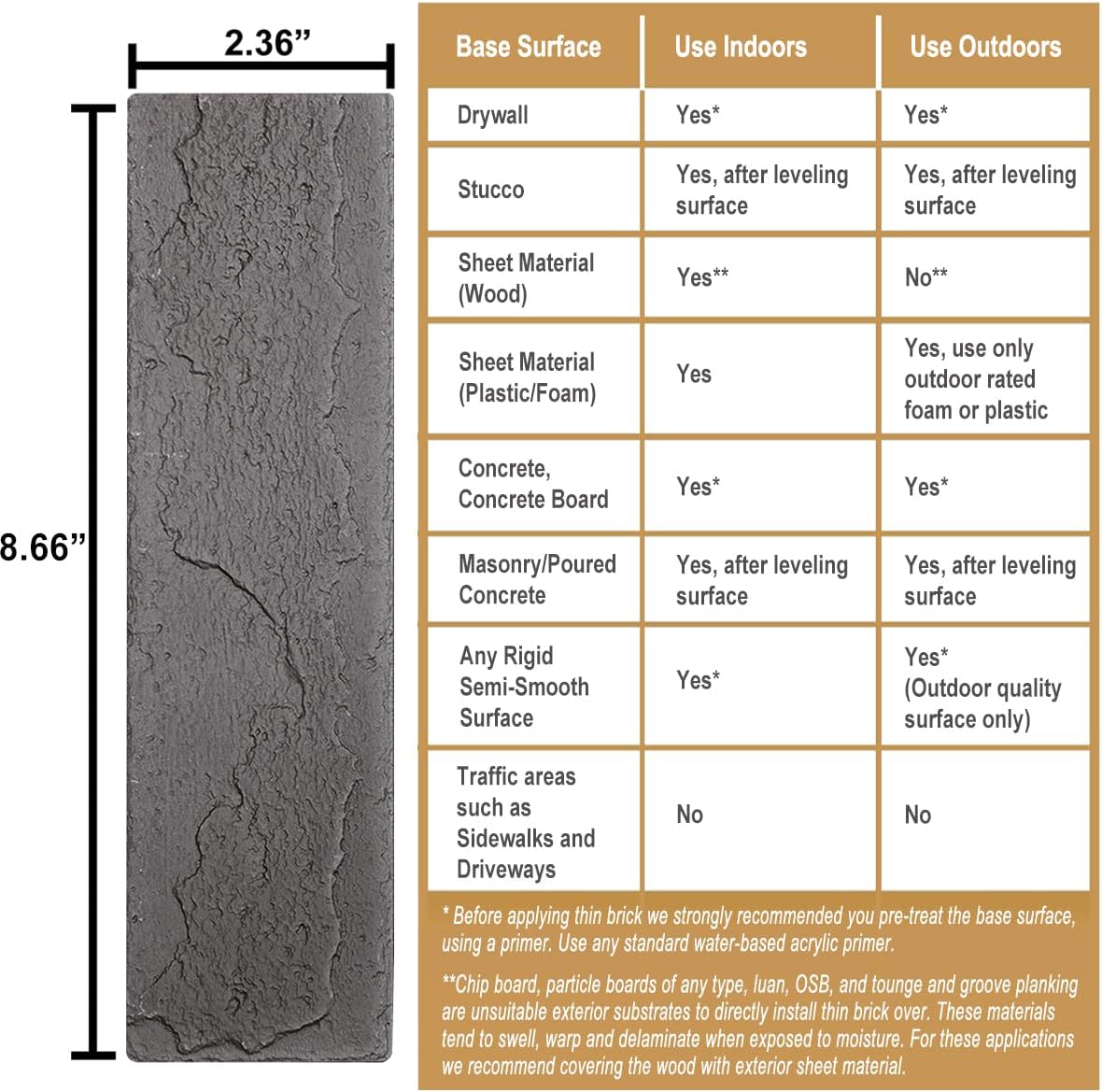- Made from durable inorganic mineral powder and poly-acrylic binder, with a matte texture finish. The thin brick veneer is flexible and can be used on curved walls. NOTE: it is recommended to spray primer on the brick surface to avoid stains and oil if used in the kitchen.