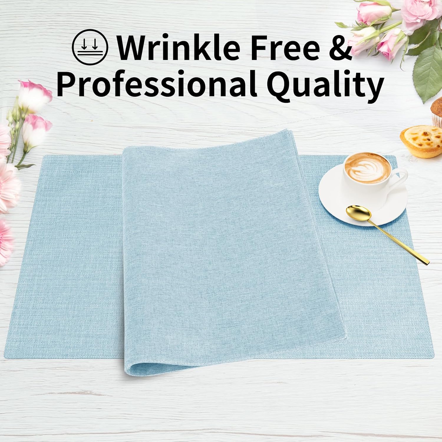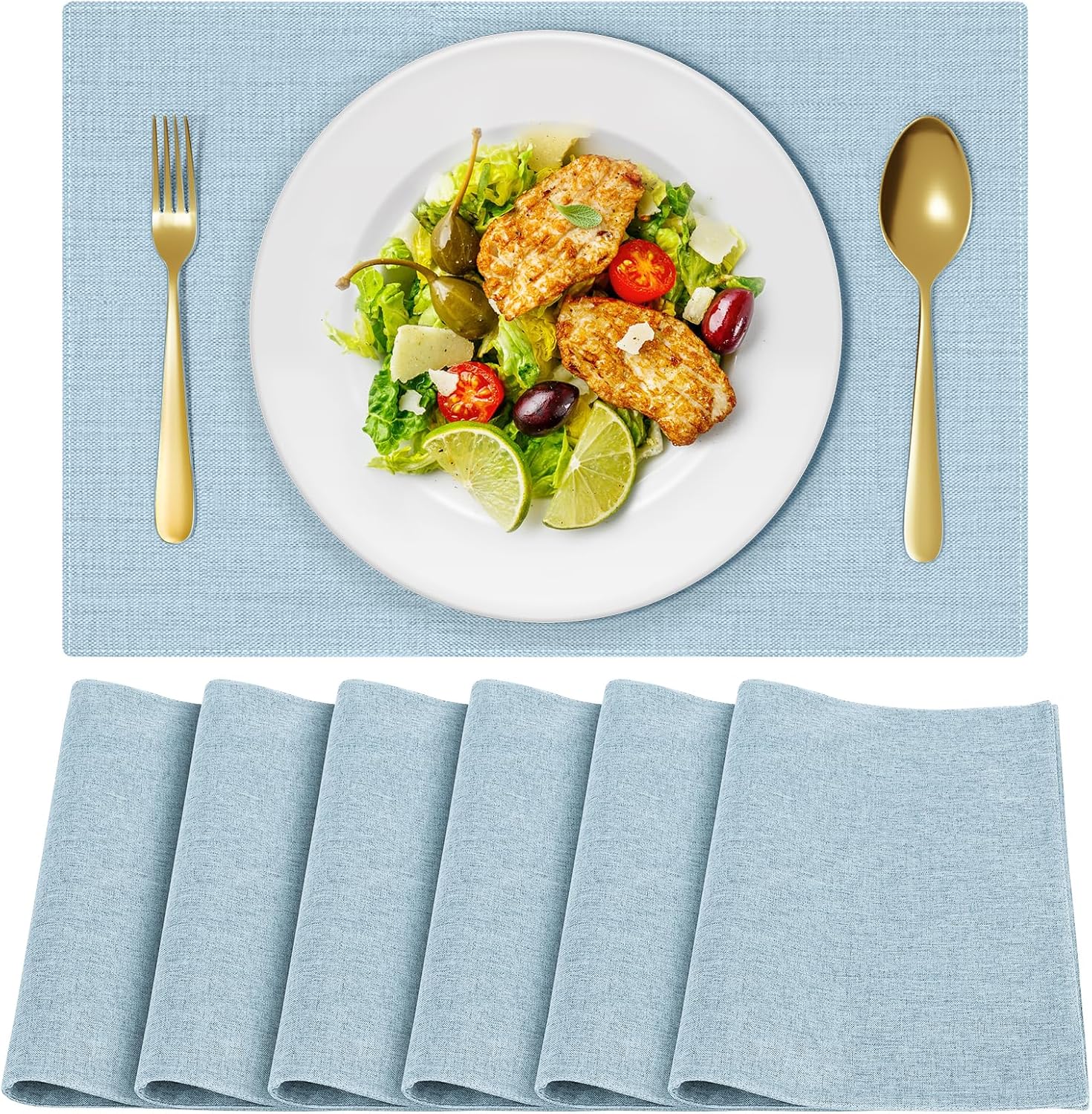 Cloth Placemats, Set of 6 Heat-Resistant Cotton Linen Blend Double Layered Machine Washable Place Mats, Wrinkle Free Thick Fabric Dining Table Mats for Indoors & Outdoors (Sky Blue, 6)