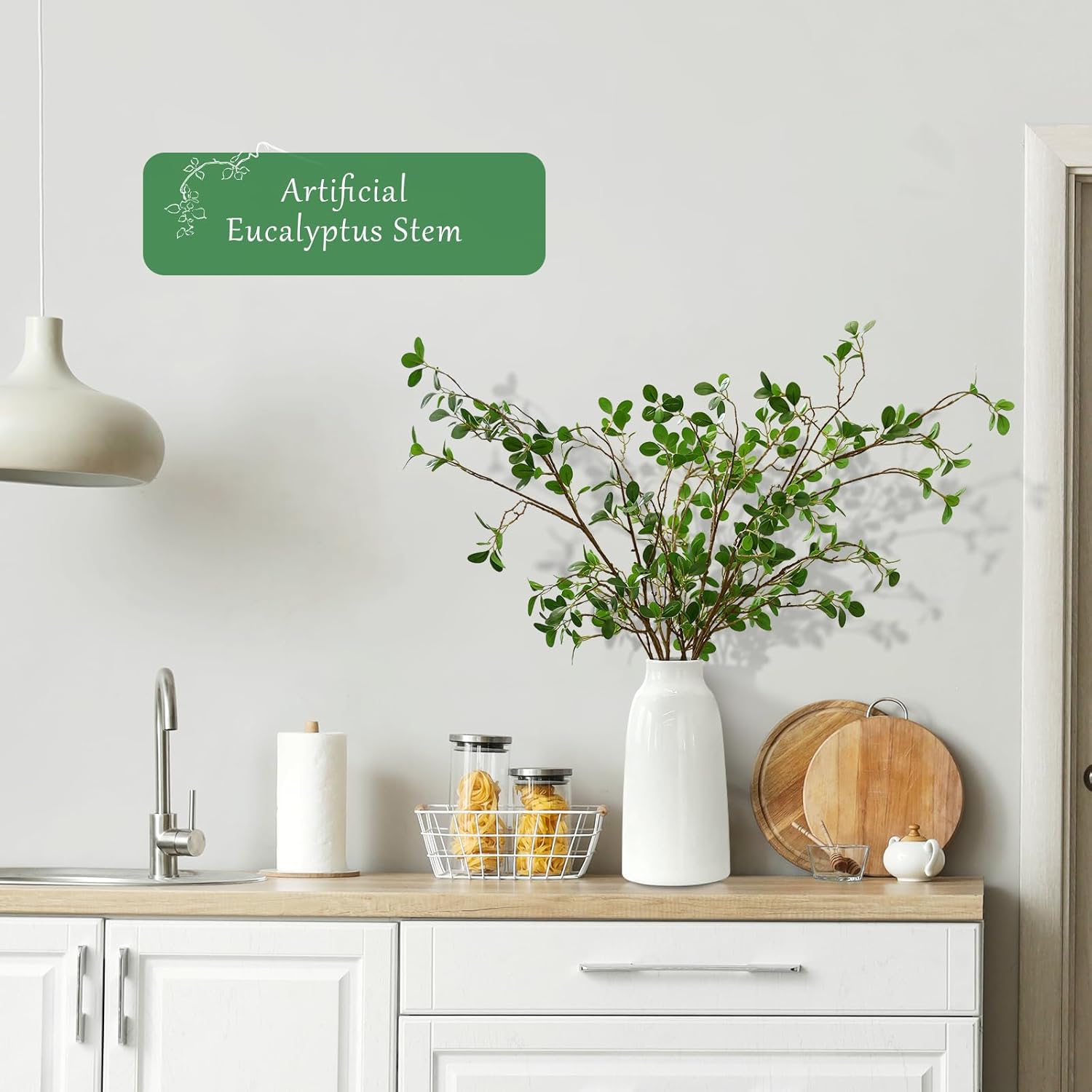 - Eucalyptus Stems: Artificial olive branches used to decorate vases. These green stems have a very realistic appearance and can be placed alone in the vase or paired with other plants to fill and decoration.