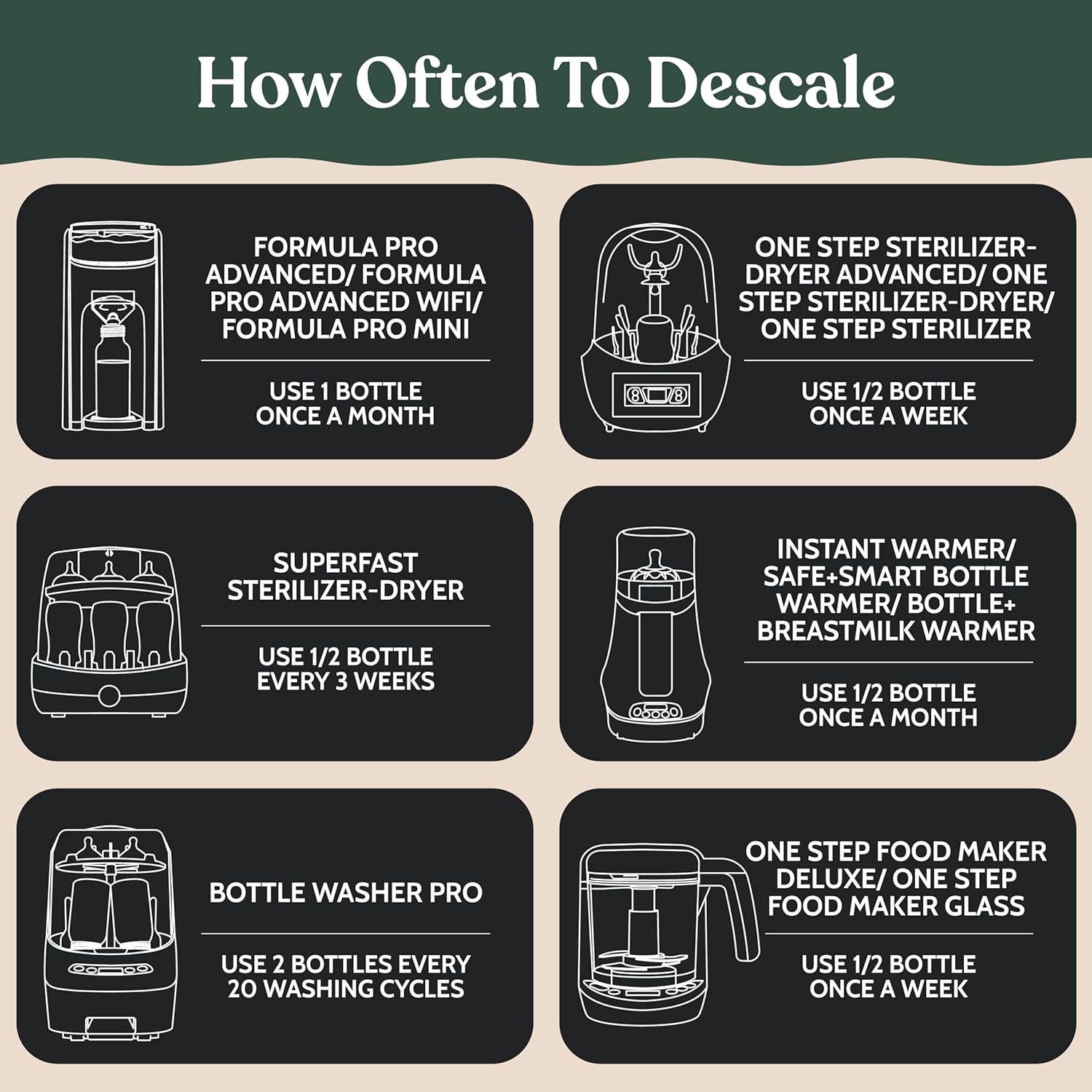 - EFFECTIVE & FAST ACTING - The descaling solution removes milk buildup and reduces harmful residues that could affect your baby's safety. It boosts appliance efficiency and is specially formulated for all Baby Brezza machines