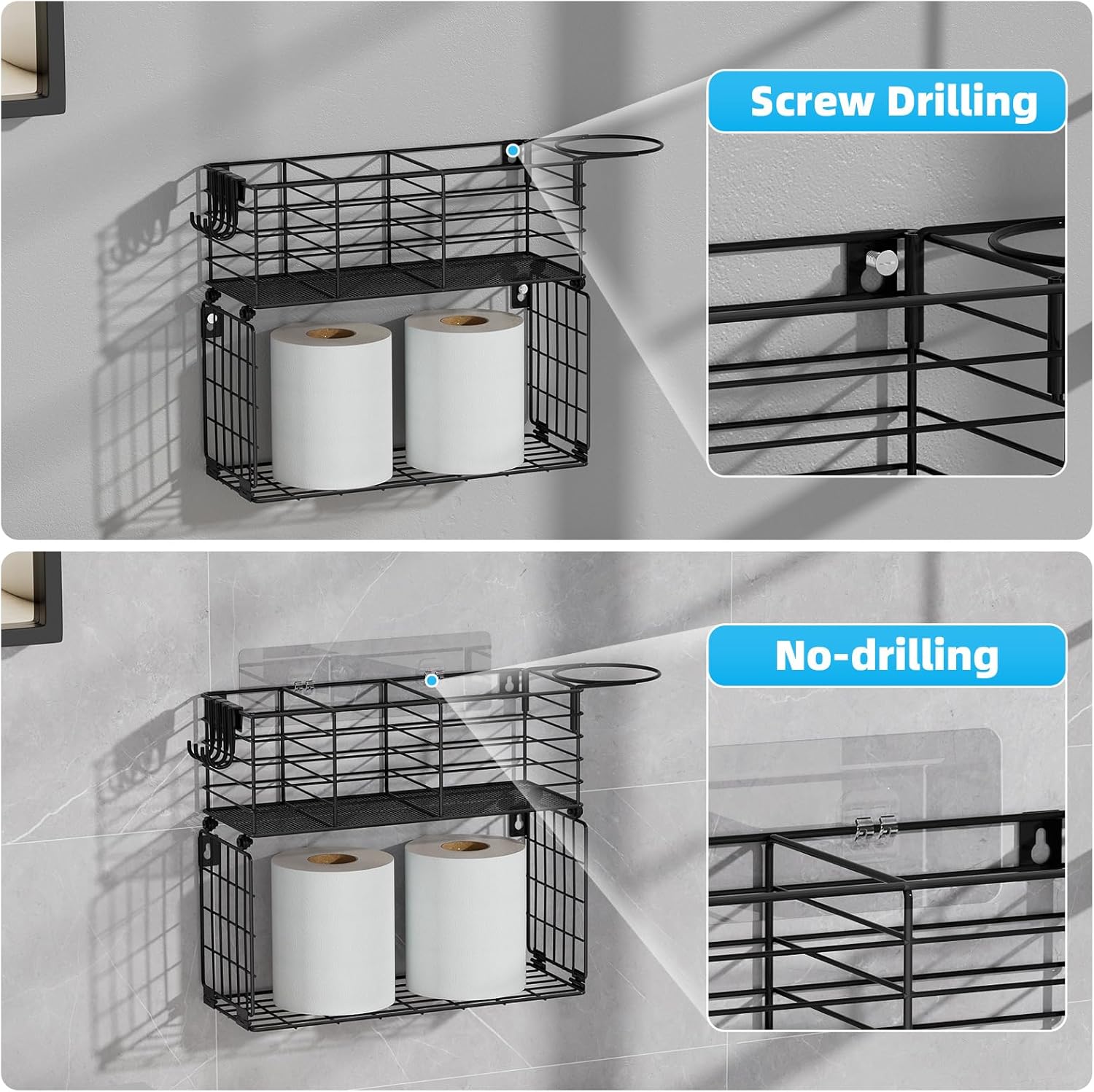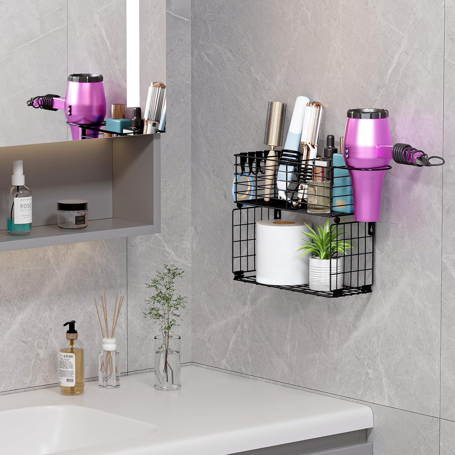 - 【Detachable and Versatile Design】This 2-tier blow dryer holder can be separated and used independently, making it flexible for different scenarios. Place them on bathroom countertops or above the toilet to maximize space utilization.
