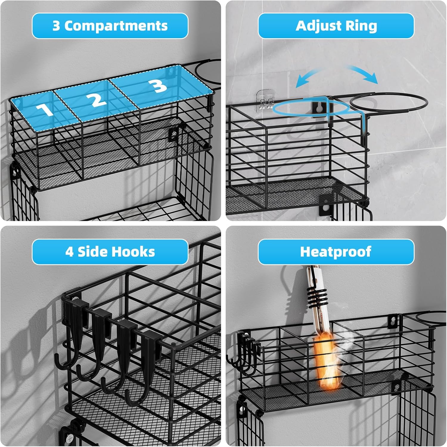 - 【Heat-Resistant Material】The wall-mounted hair tool organizer is made of high-quality metal, it withstands high temperatures, making it durable and safe for storing hot styling tools like straighteners and curling irons without deformation or rusting.