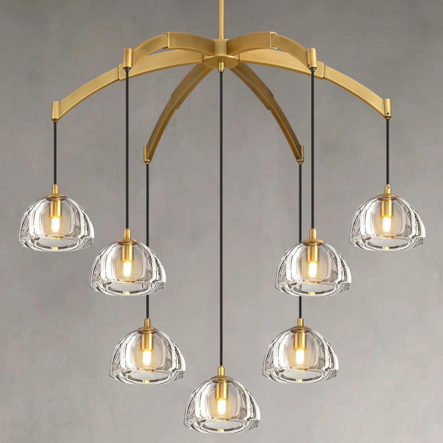 - Sleek Round Modern Design: The circular Golden frame and seven transparent glass shades create a minimalist yet bold statement. Ideal as a modern chandelier or round chandelier, its clean lines add architectural sophistication to any space.