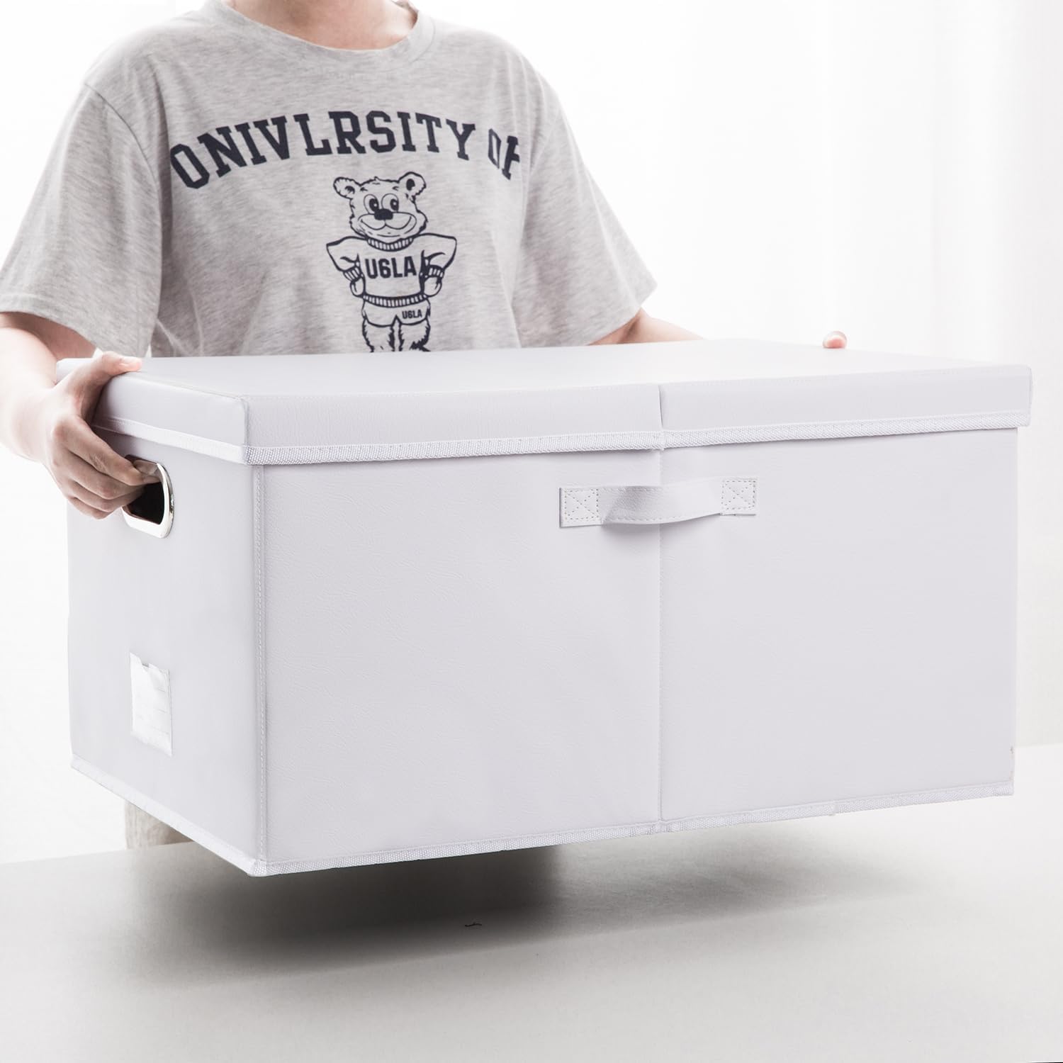 PRANDOM Collapsible Storage Box with Lid [3-Pack] Leather Fabric Foldable Storage Bin Organizer Container Basket Cube with Cover for Home Bedroom Closet Office Nursery White(22.8X15.7X11.8)