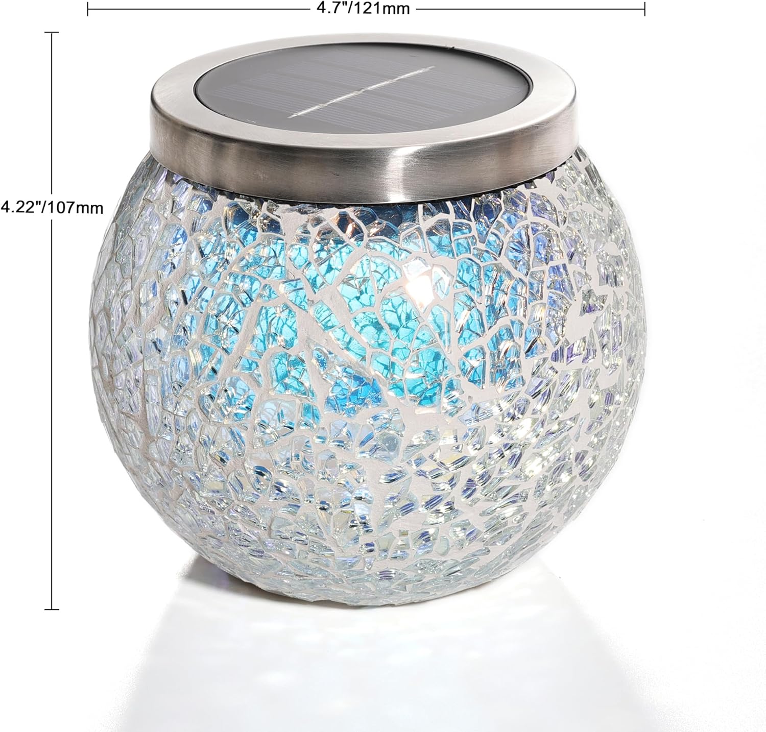 - 《 Signature Mosaic Glass That Changes with Light》Crafted with our exclusive color-shifting glass finish, the crackled mosaic surface reflects light in ever-changing hues. Head-on, it’s a deep burgundy; from the side, it shimmers in ocean blues and violets. Even before sunset, this lantern turns your outdoor space into a living work of art—no switch required.
