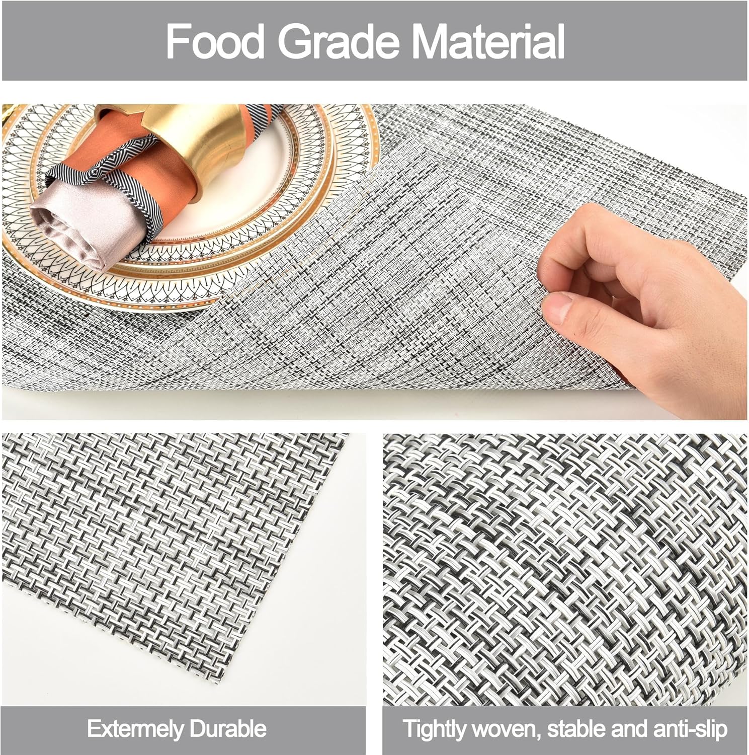 - Environmentally Material: 70% PVC and 30% Polyester. PVC materials are used for the placemats, very durable, flame-retardant, no fading and heat resistant, very safe to use, all placemats are cut by machine with no rough selvedge, free bending, free cutting. Placemats for dining table set of 4, they are the best decoration and protection for your dining table