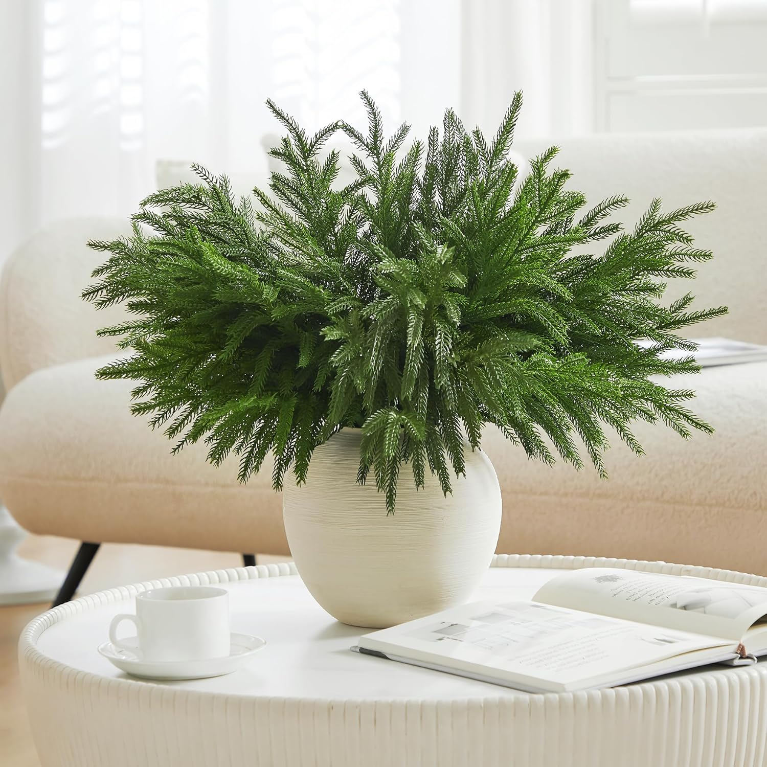 - Quantity and Size: With 16pcs Norfolk pine stems included in each bulk purchase, you have sufficient artificial pine branches to create stunning arrangements throughout your home. Each Norfolk Pine Branch is about 18 Inches and made of soft plastic which make these Norfolk pine stems hung down naturally. It is perfect Christmas greenery for vase filler and Christmas centerpieces for tables.